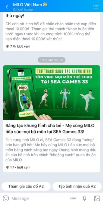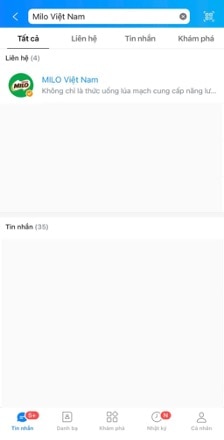 hoặc Người Chơi có thể nhập “MILO Việt Nam” vào thanh tìm kiếm, truy cập OA MILO Việt Nam và truy cập vào ứng dụng của chương trình từ thanh menu của OA như hình dưới