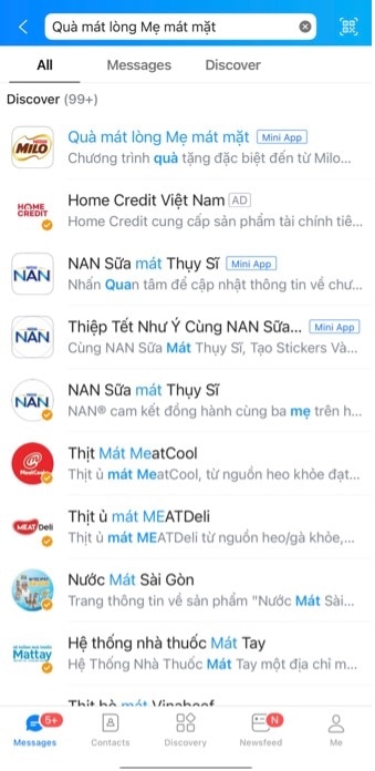 Cách 3: Mở ứng dụng Zalo, nhập “Quà mát lòng Mẹ mát mặt” vào thanh tìm kiếm và lựa chọn ứng dụng “Quà mát lòng Mẹ mát mặt” như hình dưới